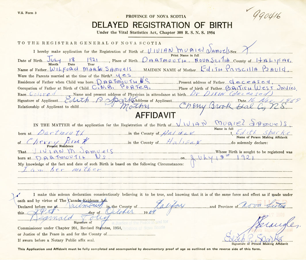I hereby make application for the Registration of Birth of Vivian MurielSamuels Sex Female