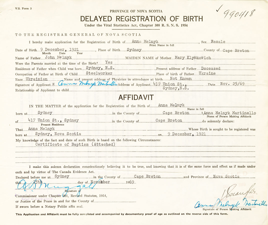 21. Name and Post Office address of Informant Anna Melnyk Martinello 417 Union St. Sydney