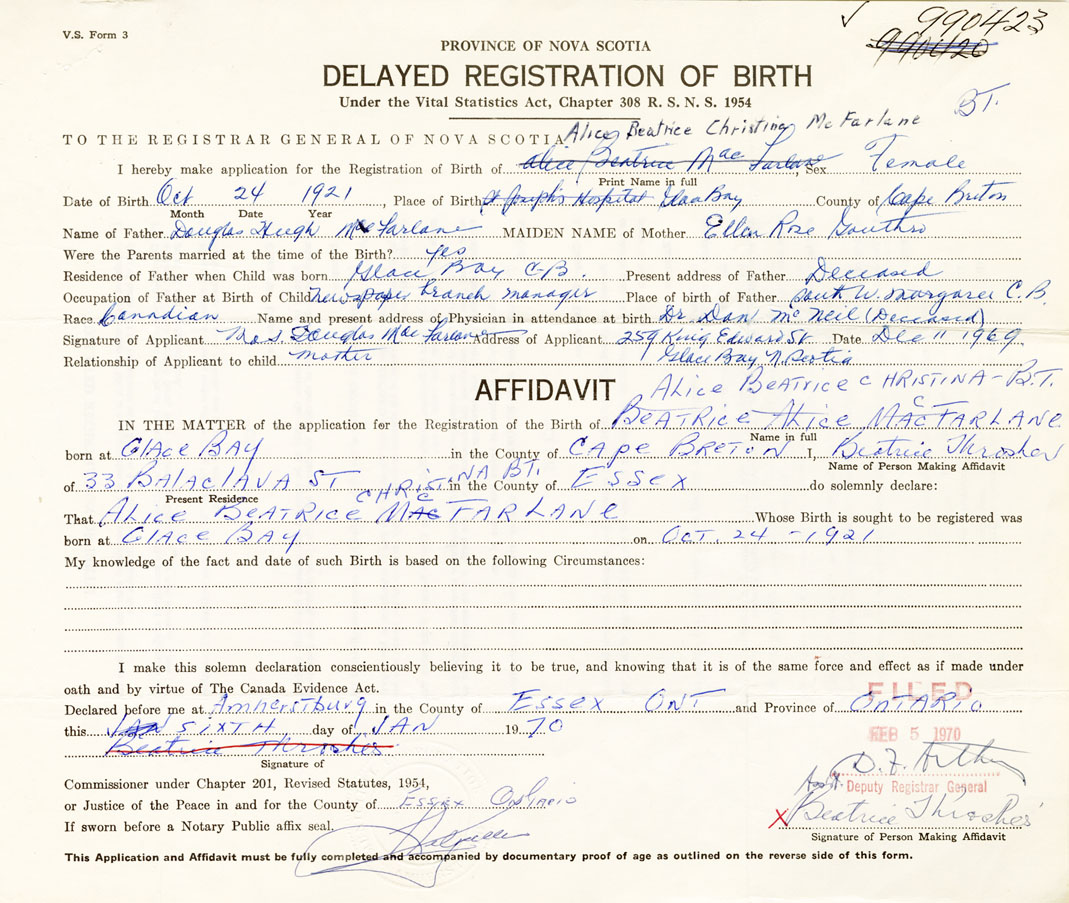 IN THE MATTER of the application for the Registration of the Birth of Alice Beatrice ChristineMcFarlane