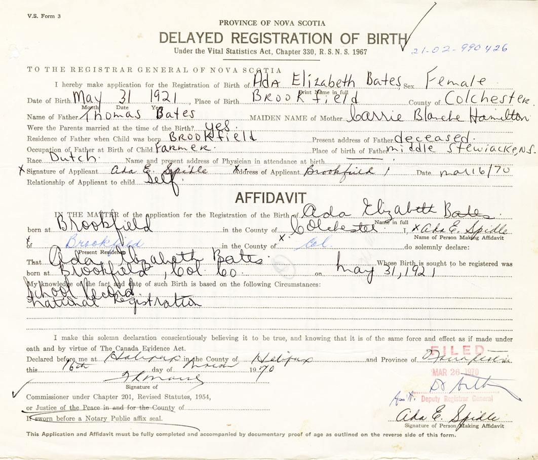 I hereby make application for the Registration of Birth of Ada ElizabethBates Sex Female