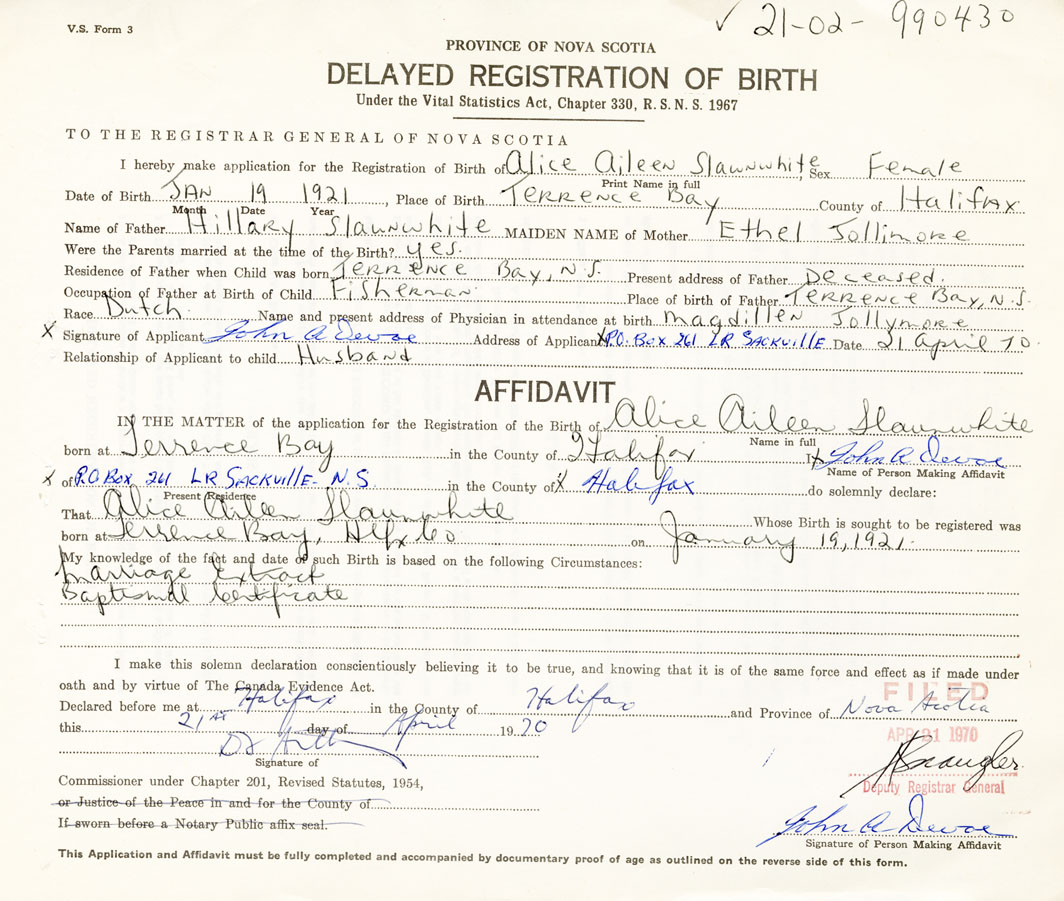 Name of Father Hillary Slaunwhite MAIDEN NAME of Mother Ethel Jollimore