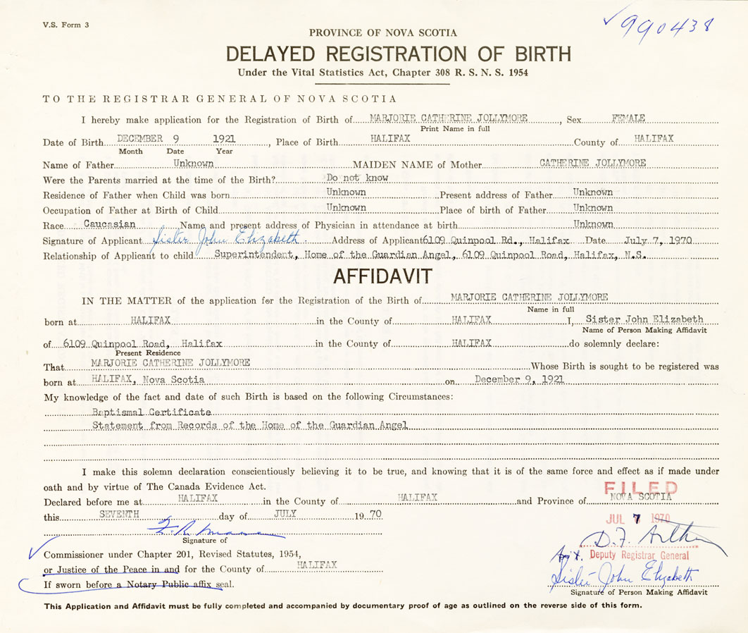 I hereby make application for the Registration of Birth of Marjorie CatherineJollymore Sex Female