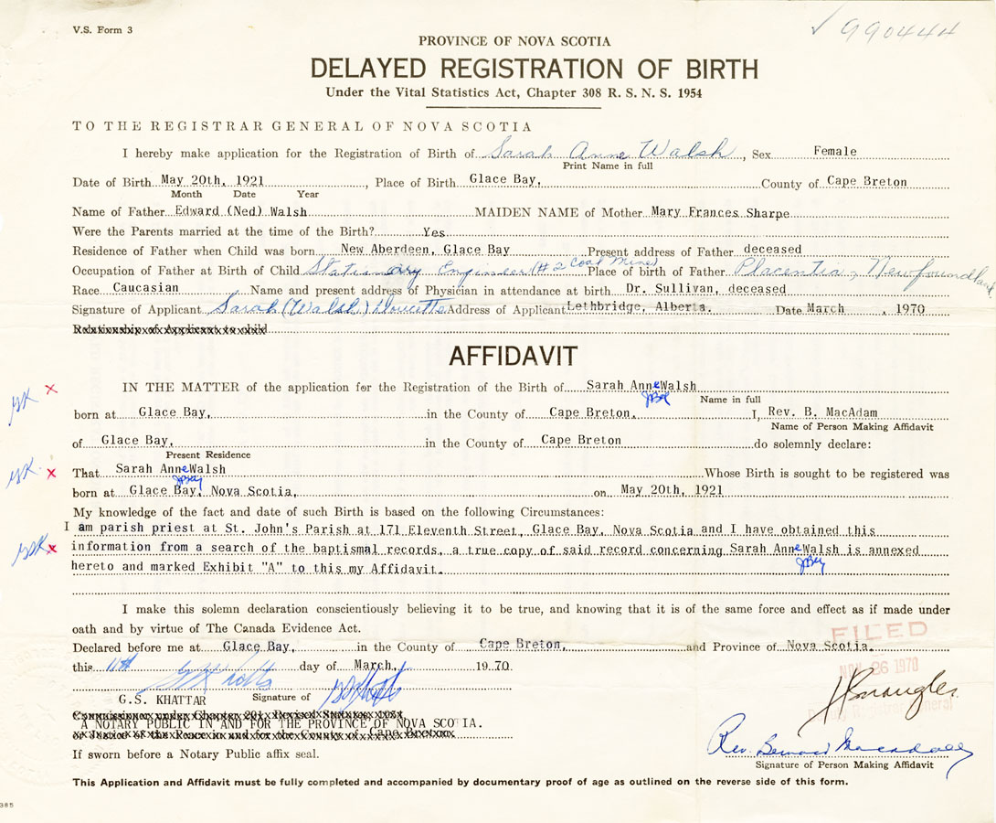 21. Name and Post Office address of Informant Sarah Walsh Doucette Lethbridge, Alberta