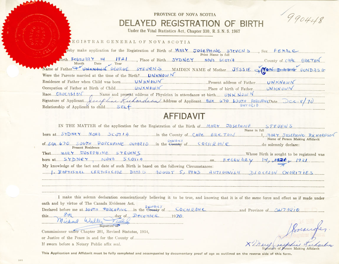 Signature of Applicant Josephine Richardson Address of Applicant Box 670 South Porcupine, Ontario Date December 8, 1970