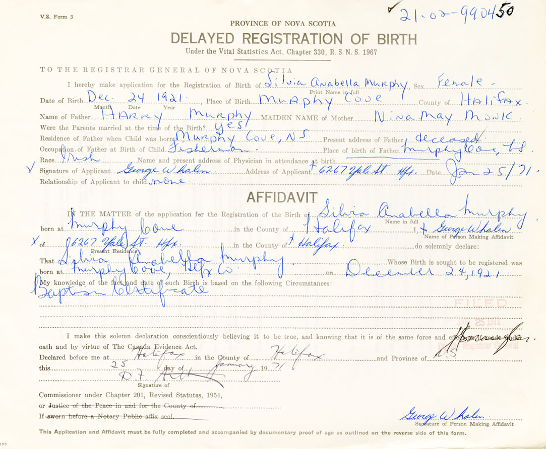 Date of Birth December 24, 1921 Place of Birth Murphy CoveCounty of Halifax