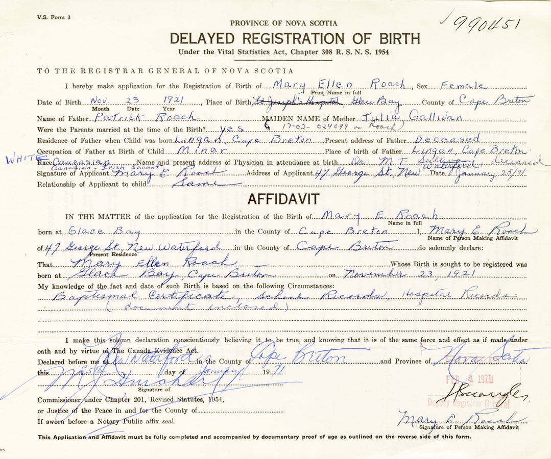 Signature of Applicant Mary E. Roach Address of Applicant 47 George St. New Waterford Date January 25, 1971