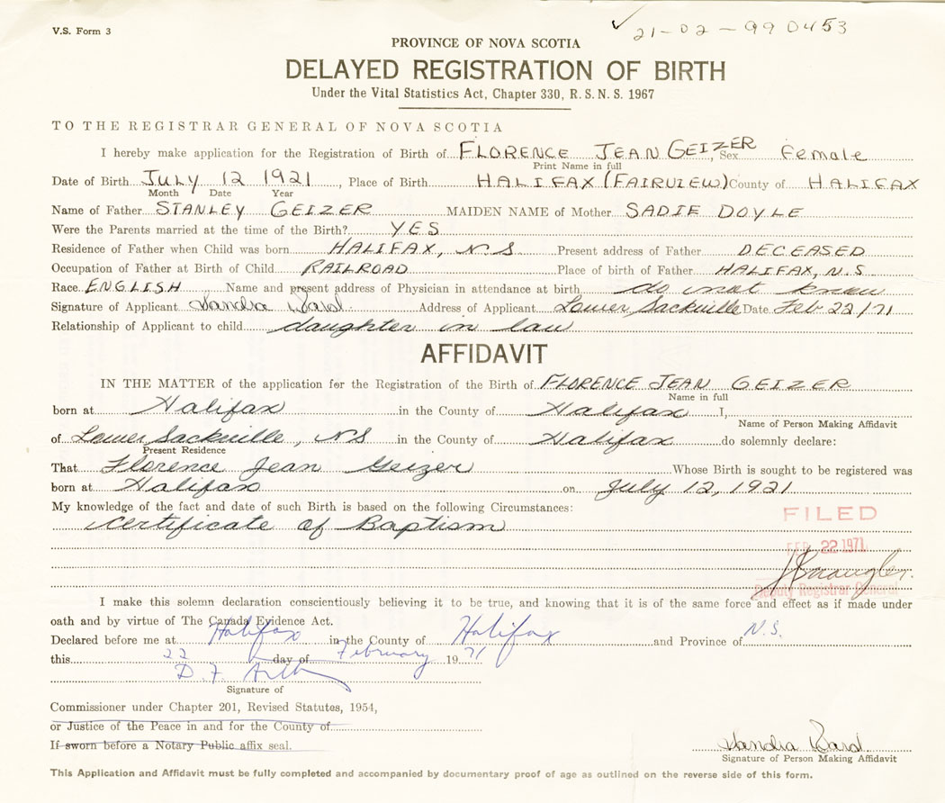 IN THE MATTER of the application for the Registration of the Birth of Florence JeanGeizer