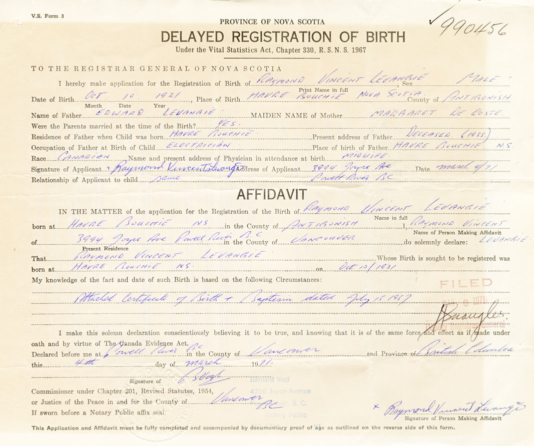 I hereby make application for the Registration of Birth of Raymond VincentLevangie Sex Male