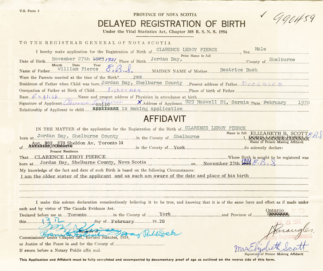 I hereby make application for the Registration of Birth of Clarence LeRoyPierce Sex Male