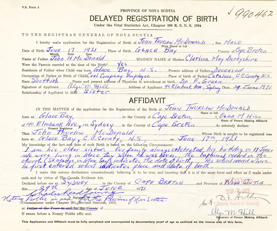 Date of Birth June 17, 1921 Place of Birth Glace BayCounty of Cape Breton