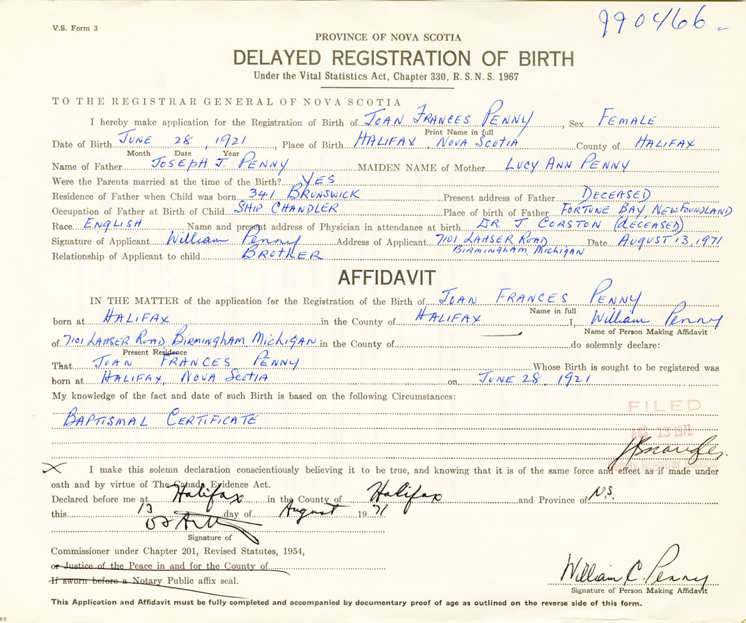I hereby make application for the Registration of Birth of Joan FrancesPenny Sex Female