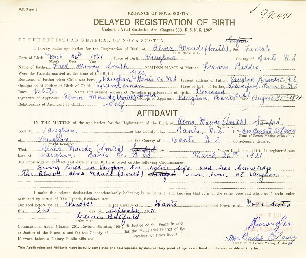 Signature of Applicant Alma Maude Smith Sanford Address of Applicant Vaughan Date August 31, 1971