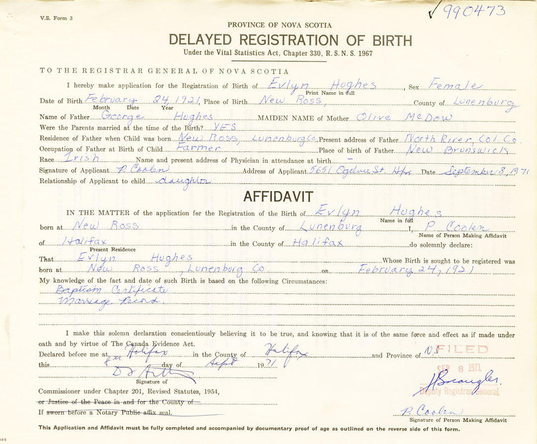 I hereby make application for the Registration of Birth of EvlynHughes Sex Female