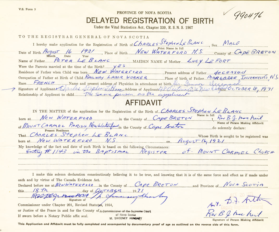 I hereby make application for the Registration of Birth of Charles StephenLeBlanc Sex Male