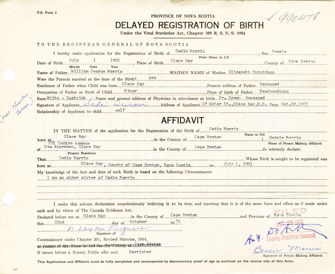 Signature of Applicant Sadie Turner Address of Applicant 18 Water St. Glace Bay Date October 22, 1971