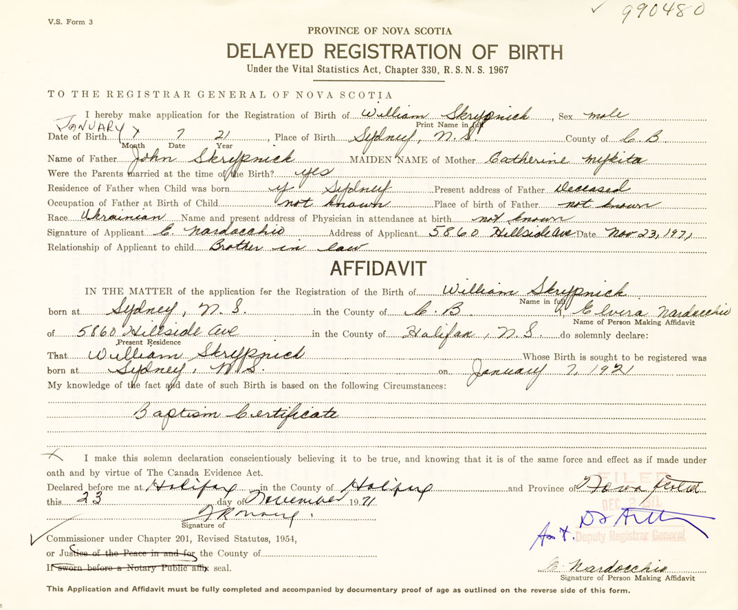 I hereby make application for the Registration of Birth of WilliamSkrypnick Sex Male