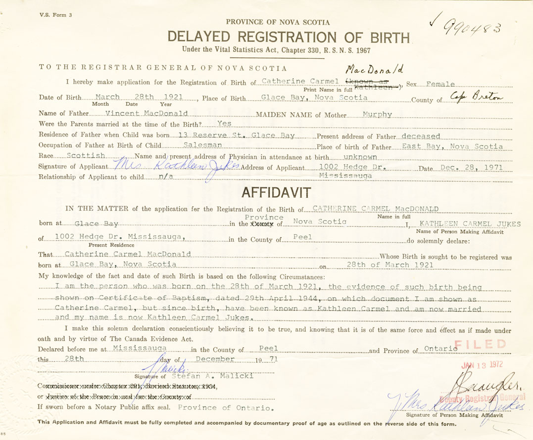 I am the person who was born on the 28th of March 1921, the evidence of such birth being shown on Certification of Baptism, dated 29th April 1944, on which document I am shown as Catherine Carmel, but since birth, have been known as Kathleen Carmel and am now married and my name is now Kathleen Carmel Jukes.
