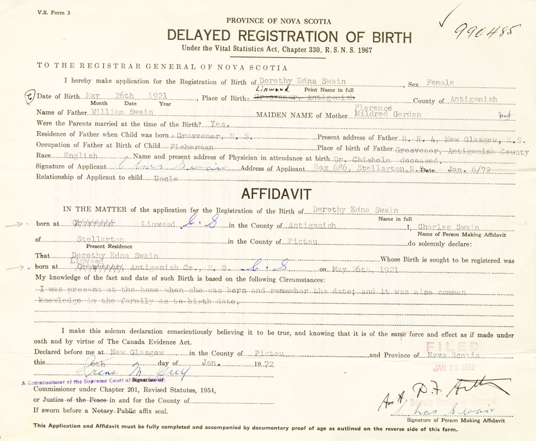 IN THE MATTER of the application for the Registration of the Birth of Dorothy EdnaSwain