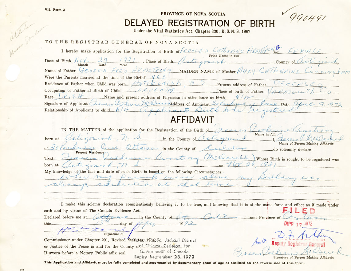 Date of Birth November 29, 1921 Place of Birth AntigonishCounty of Antigonish