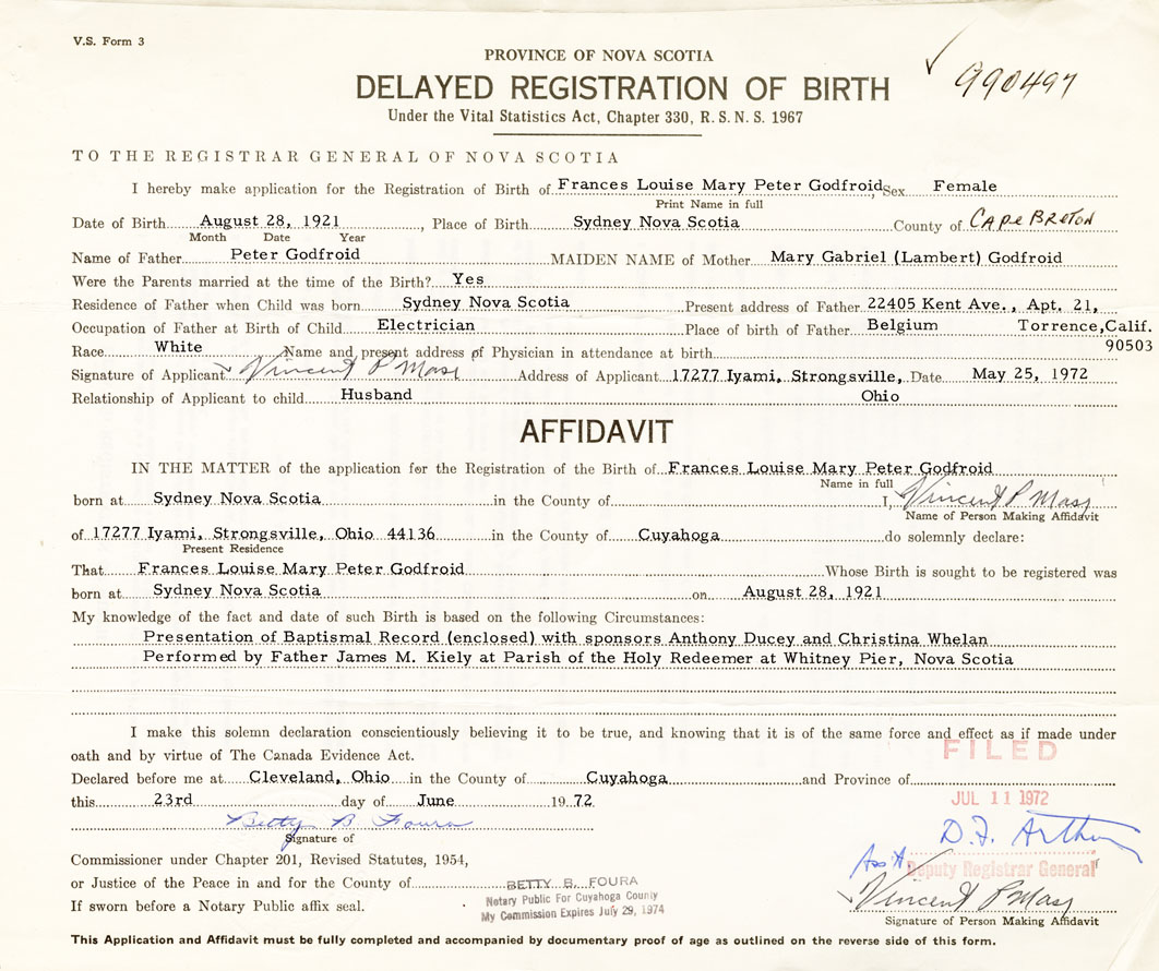 I hereby make application for the Registration of Birth of Frances Louise Mary PeterGodfroid Sex Female