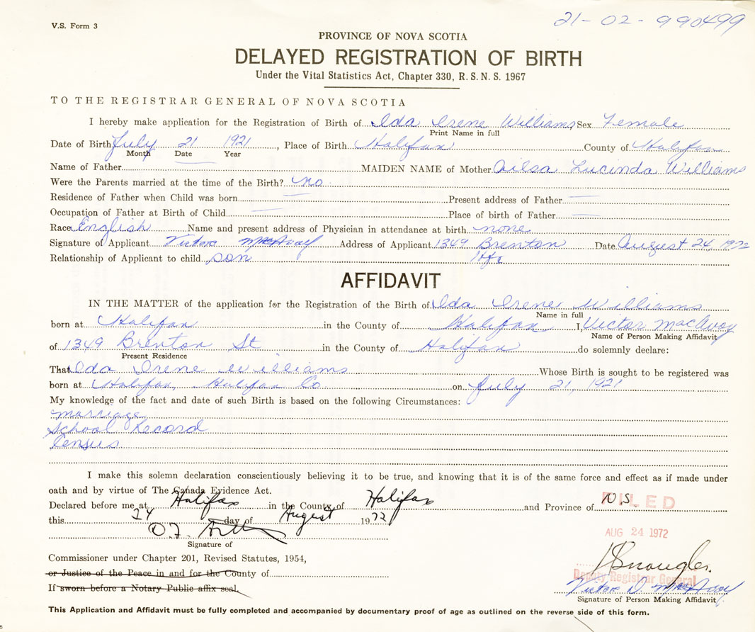 IN THE MATTER of the application for the Registration of the Birth of Ida IreneWilliams