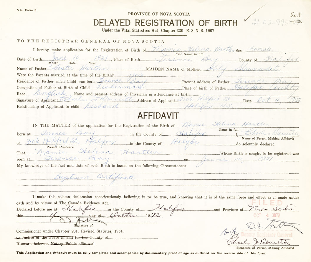Date of Birth June 10, 1921 Place of Birth Terence BayCounty of Halifax