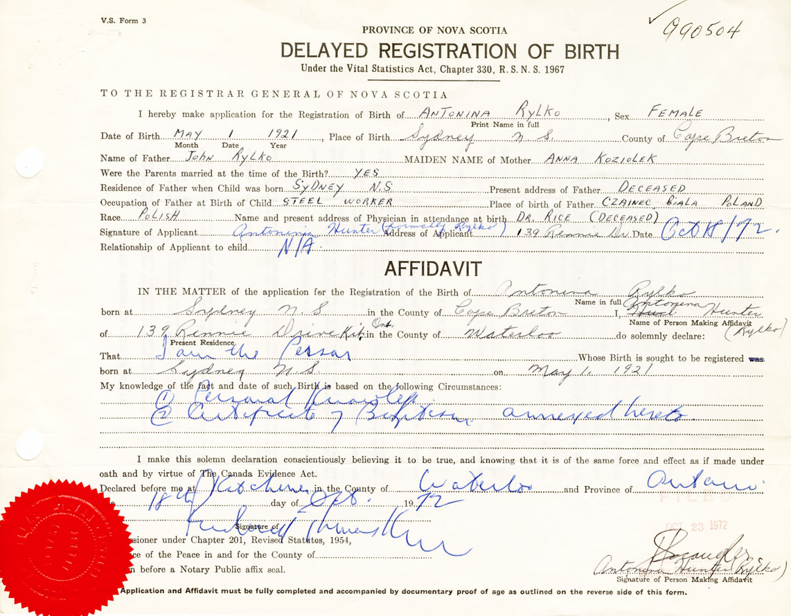 I hereby make application for the Registration of Birth of AntoninaRylko Sex Female