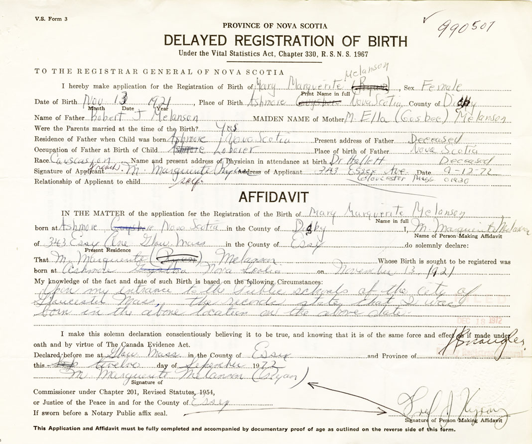 I hereby make application for the Registration of Birth of Mary MargueriteMelanson Sex Female