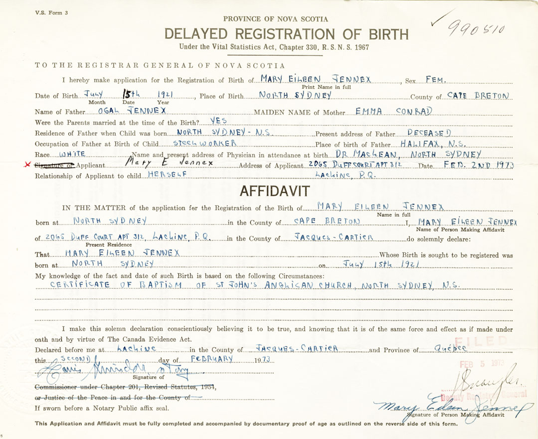I hereby make application for the Registration of Birth of Mary EileenJennex Sex Female