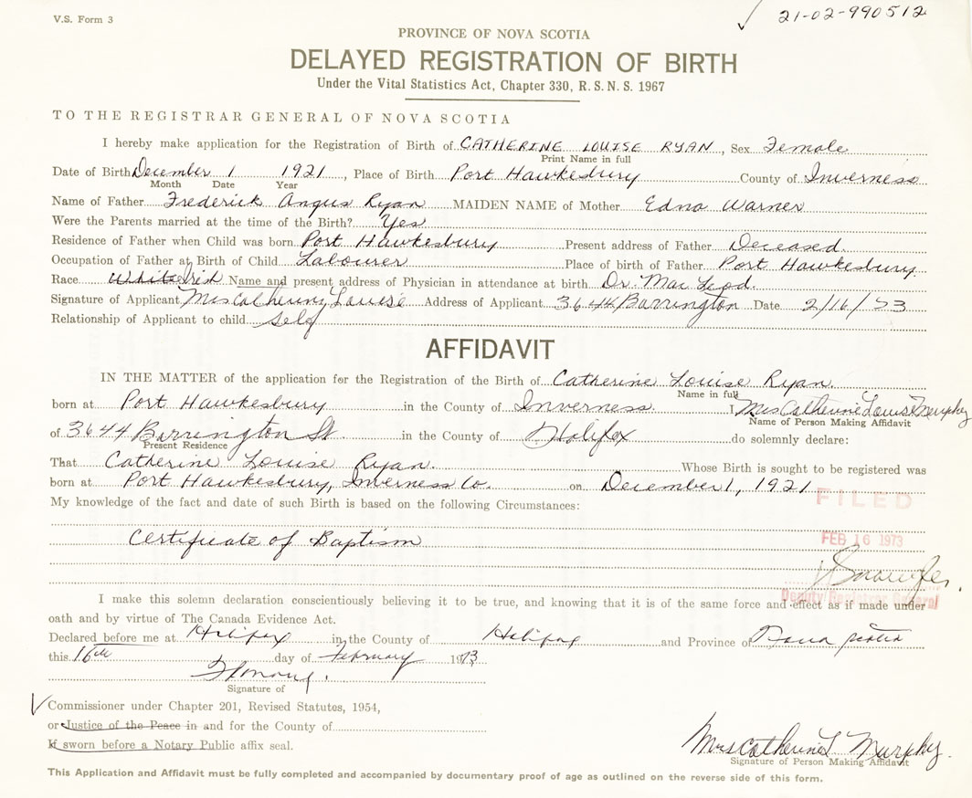 Signature of Applicant Mrs. Catherine Louise Murphy Address of Applicant 3644 Barrington St. Halifax Date February 16, 1973