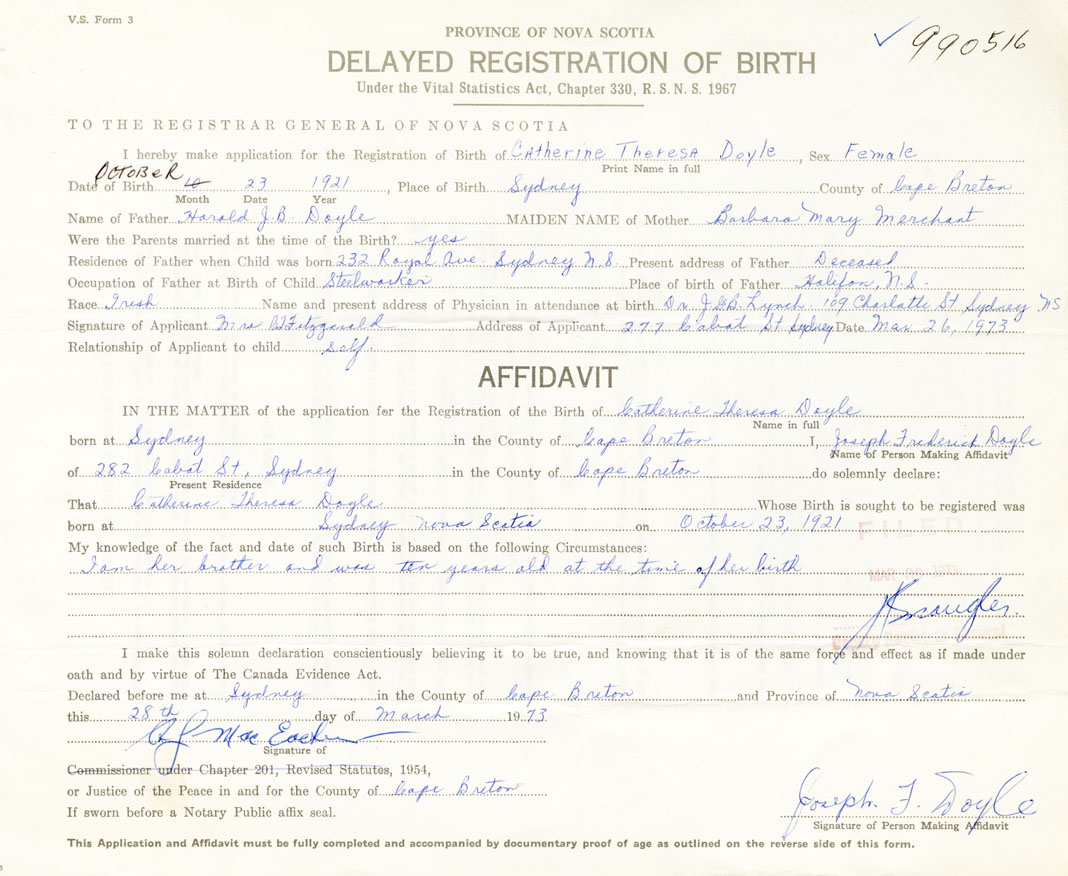 Date of Birth October 23, 1921 Place of Birth SydneyCounty of Cape Breton
