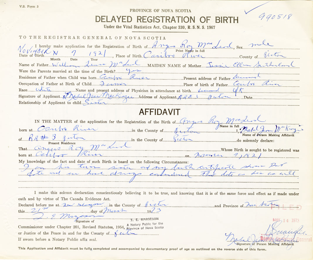 I hereby make application for the Registration of Birth of Angus RoyMacLeod Sex Male