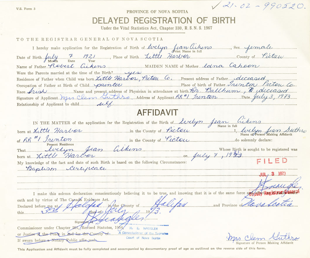 IN THE MATTER of the application for the Registration of the Birth of Evelyn JeanAikens