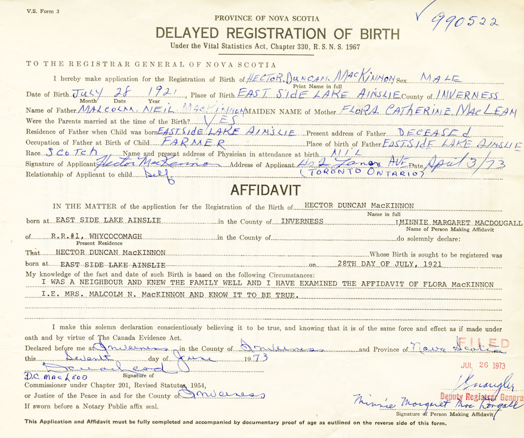 Date of Birth July 28, 1921 Place of Birth East Side Lake AinslieCounty of Inverness