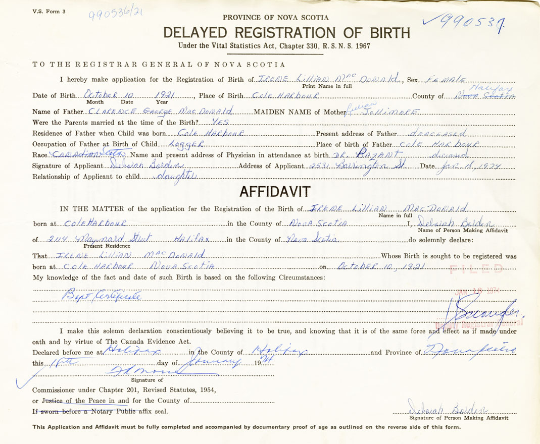 Date of Birth October 10, 1921 Place of Birth Cole HarbourCounty of Halifax