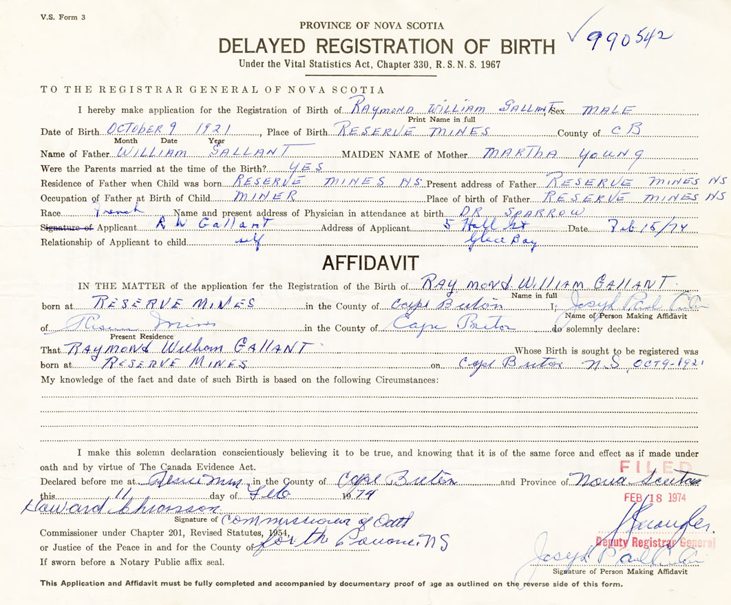 I hereby make application for the Registration of Birth of Raymond WilliamGallant Sex Male