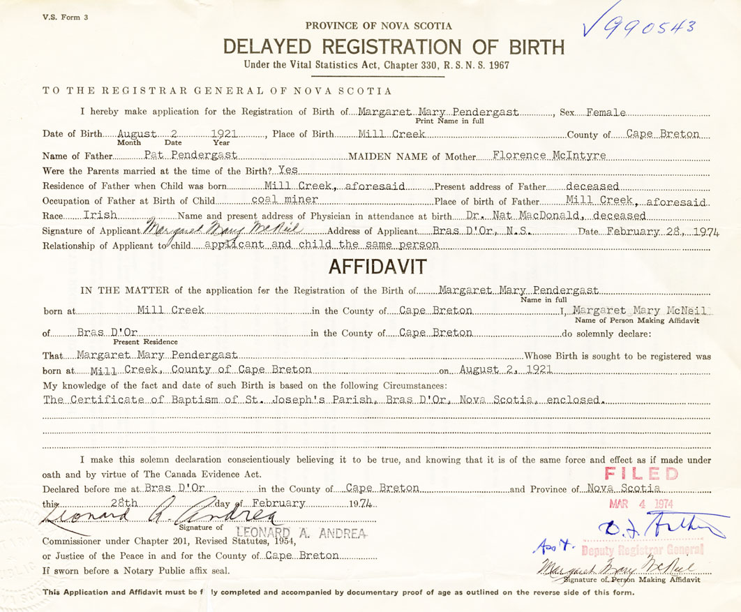 Signature of Applicant Margaret Mary McNeil Address of Applicant Bras d'Or Date February 28, 1974