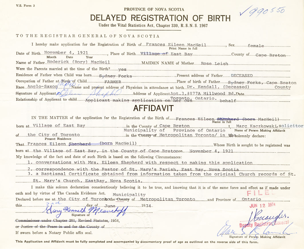 I hereby make application for the Registration of Birth of Frances EileenMacNeil Sex Female