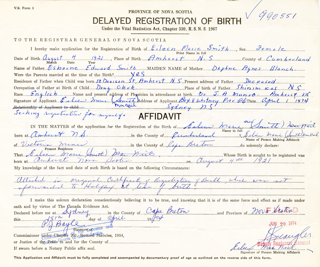 Signature of Applicant Eileen Marie Smith MacNeil Address of Applicant Box 8 Whitney Pier Date April 1, 1974