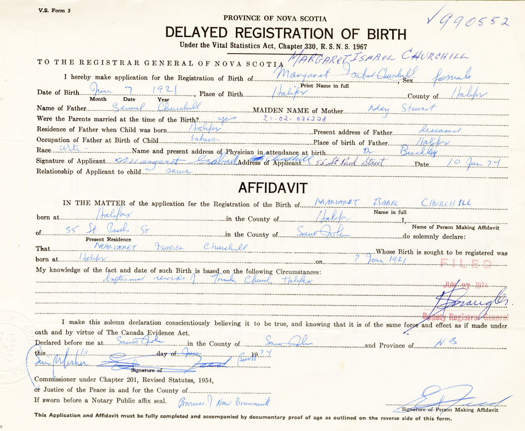 Signature of Applicant Margaret Isabel Churchill Address of Applicant 55 St. Paul St. Halifax Date 10 June 1974