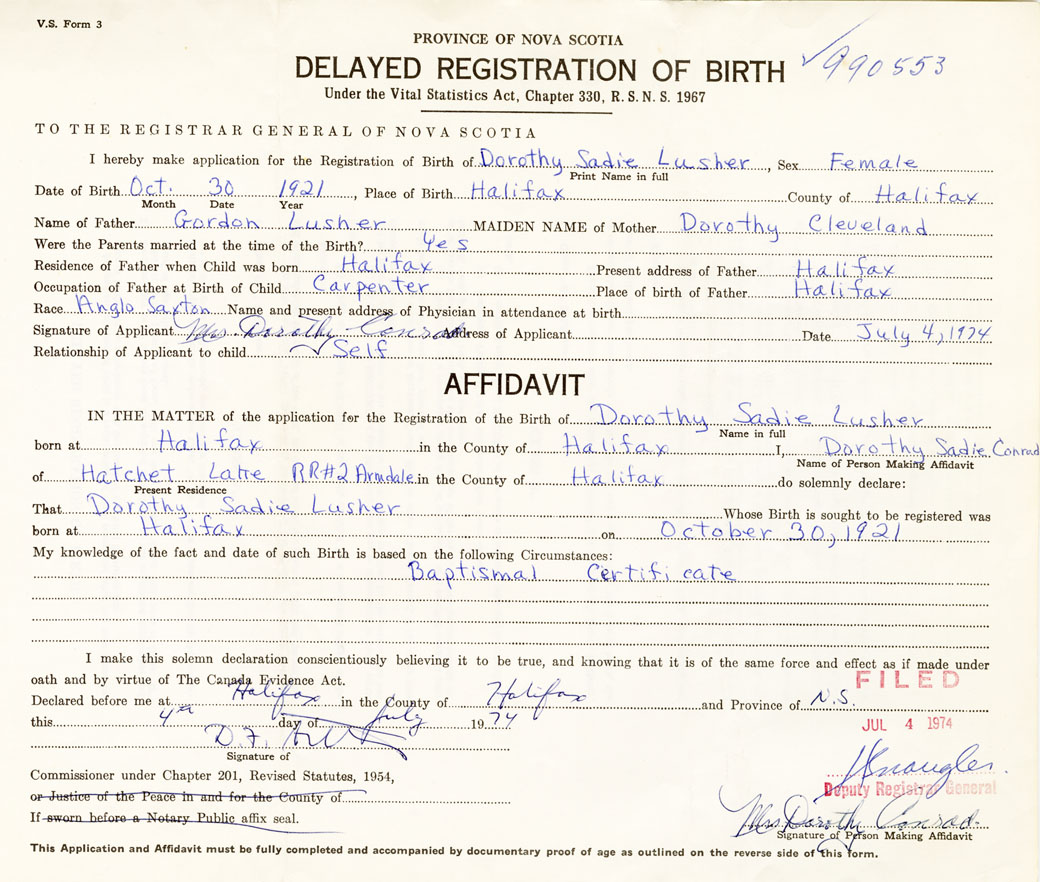 IN THE MATTER of the application for the Registration of the Birth of Dorothy SadieLusher