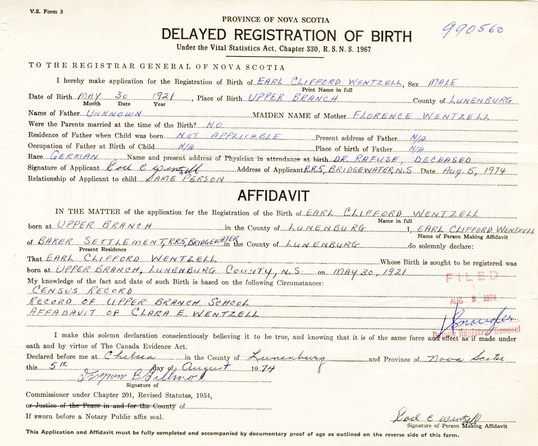 I hereby make application for the Registration of Birth of Earl CliffordWentzell Sex Male