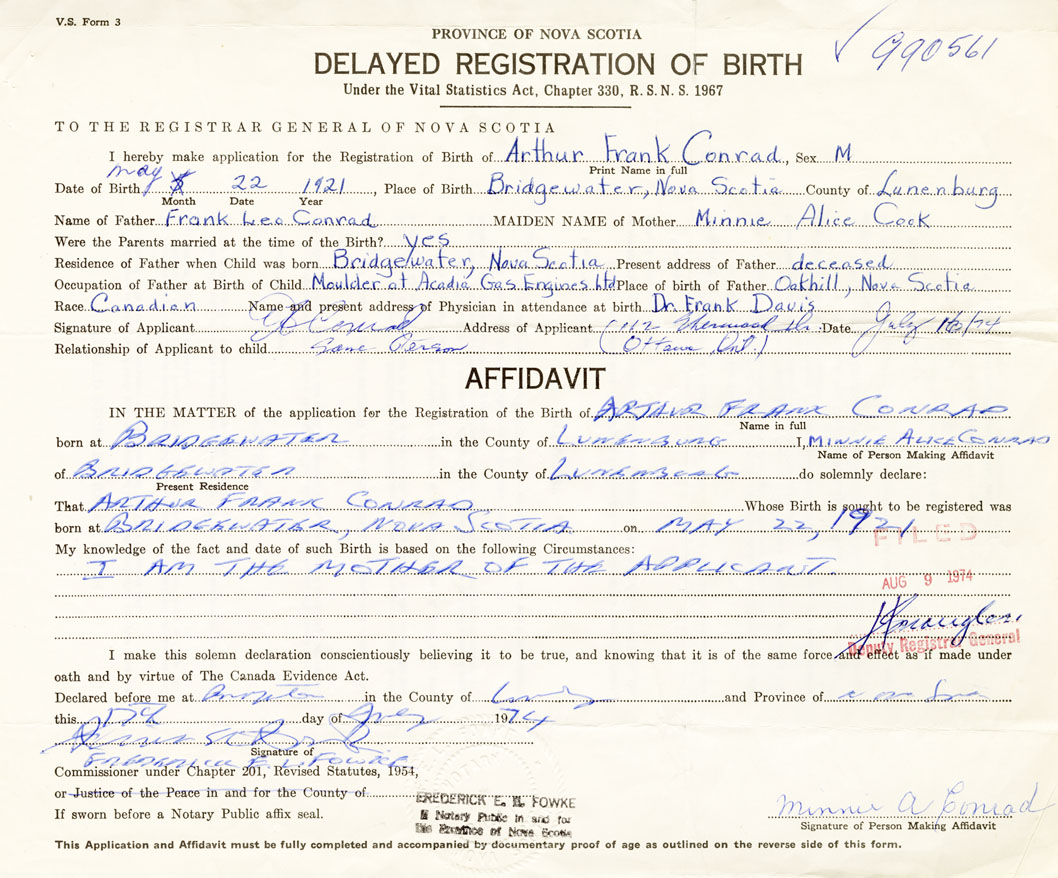 Date of Birth May 22, 1921 Place of Birth BridgewaterCounty of Lunenburg