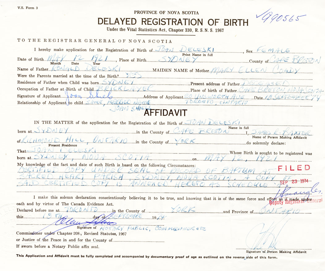 IN THE MATTER of the application for the Registration of the Birth of JoanDeleski