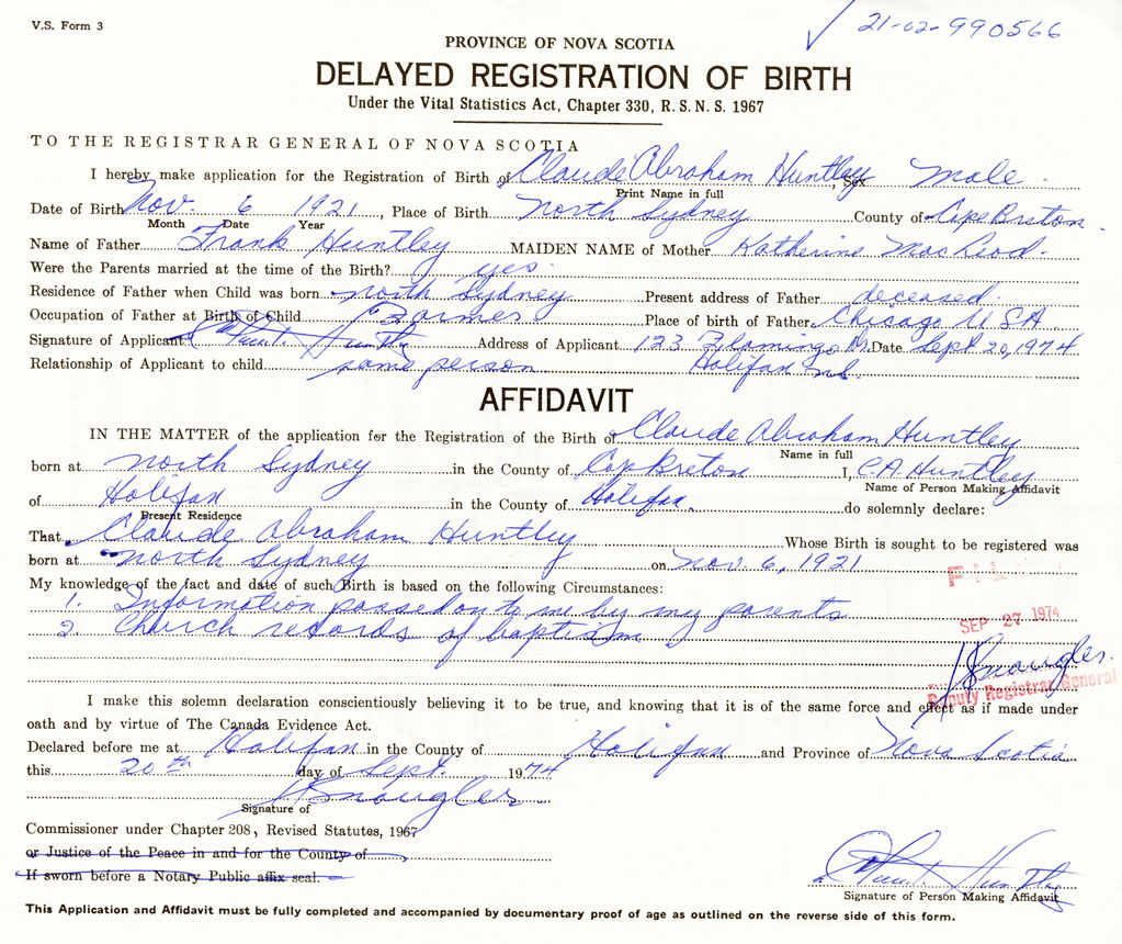 I hereby make application for the Registration of Birth of Claude AbrahamHuntley Sex Male