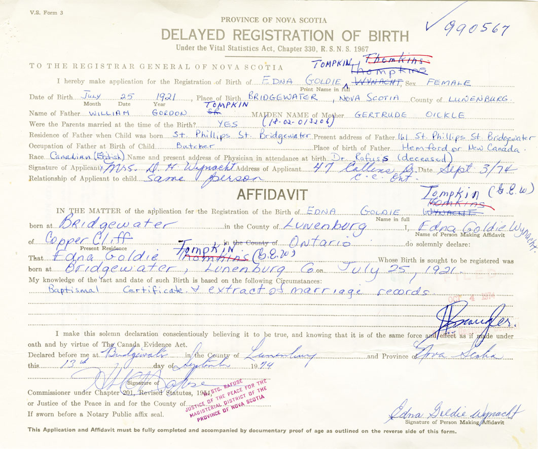 That Edna GoldieTompkin Whose Birth is sought to be registered was