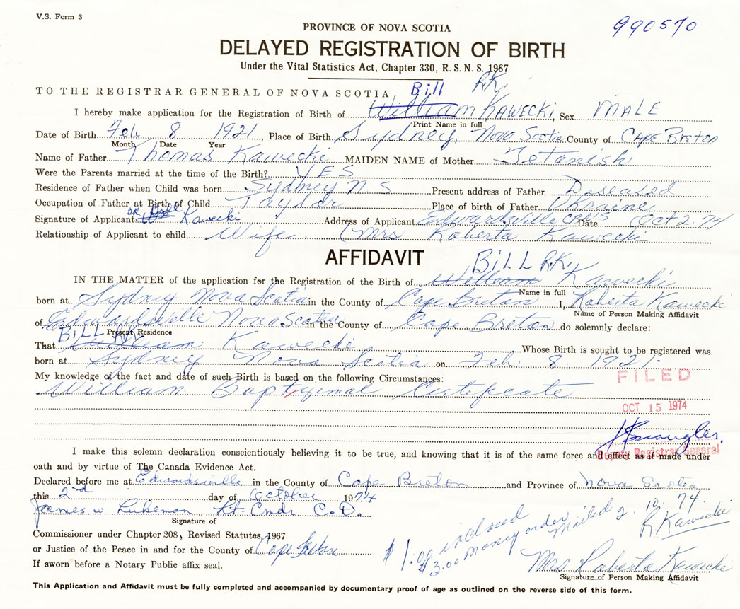 I hereby make application for the Registration of Birth of BillKawecki Sex Male