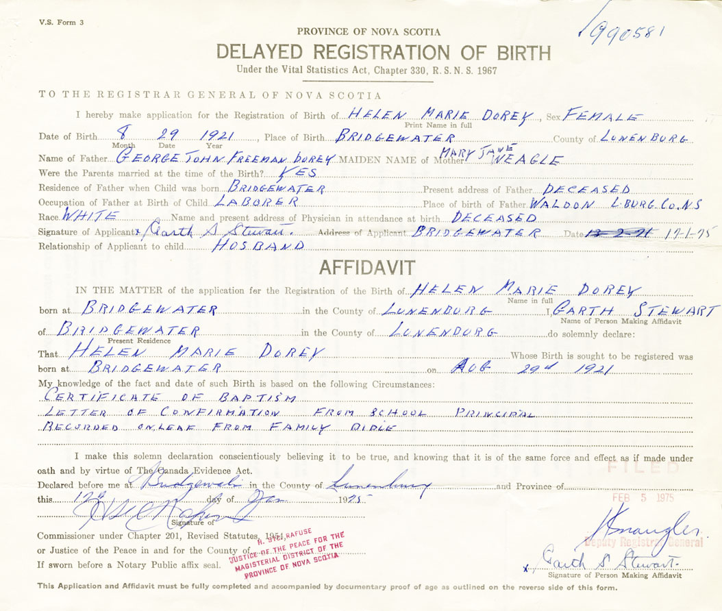 Date of Birth August 29, 1921 Place of Birth BridgewaterCounty of Lunenburg