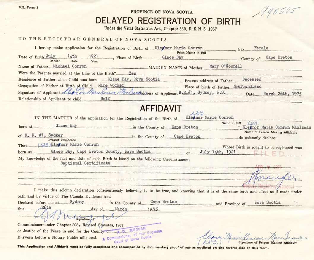 Date of Birth July 14, 1921 Place of Birth Glace BayCounty of Cape Breton