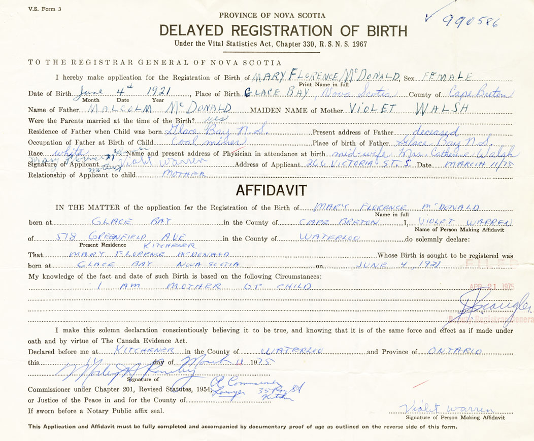 I hereby make application for the Registration of Birth of Mary FlorenceMcDonald Sex Female